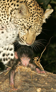 Um vídeo do Nat Geo apresenta um drama que contraria o instinto natural dos felinos[4]. Felinos matam sem piedade, ainda mais se for um filhote que é considerado uma presa fácil e muitas vezes a preferida dos grandes gatos, todavia neste vídeo uma fêmea de leopardo ao caçar um babuíno percebe que um filhote órfão ficou indefeso, então ela adota o filhote de babuíno e o protege do ataque de hienas, chegando mais tarde a desenvolver laços de carinho com aquilo que deveria ser sua caça. Tal exemplo não é único, Kanuniak uma leoa do Quênia chegou adotar 5 filhotes de antílopes no meio selvagem em apenas um ano[5] e uma tigresa do zoológico de Bangcoc adotou seis porquinhos[6] e os amamentou.